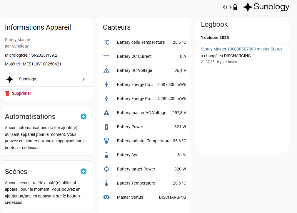 Si l'intégration Sunology avait des contrôles (en plus des capteurs) permettant de piloter la charge et la décharge de la batterie Storey les HAnautes seraient capables par des automatismes de permettre, par exemple, de la charger en heures creuses et de la décharger en heures pleines, ou bien de la charger dès qu'il n'y a plus d'électricité achetée, ce qui signifie que de l'électricité produite par les panneaux est renvoyée -gratuitement- à EDF (ou votre fournisseur d'électricité) et tout ce que l’imagination (florissante) des HAnautes permettrait !!