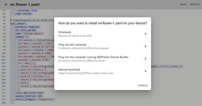 Il est possible d'éditer le fichier yaml, Ce fichier de configuration, en yaml, va déterminer les comportement et la configuration (Wifi notamment mais cela a déjà été réalisé dans une étape précédente) de l’ESP32.