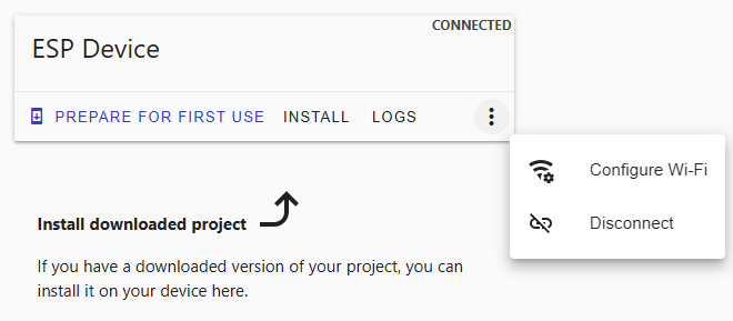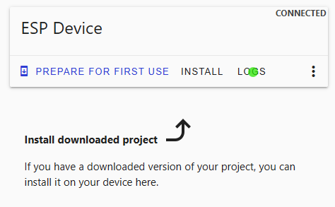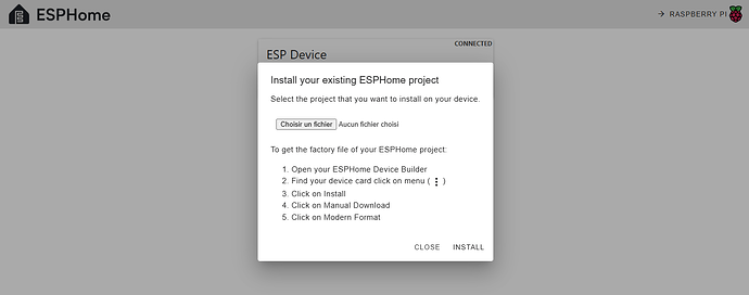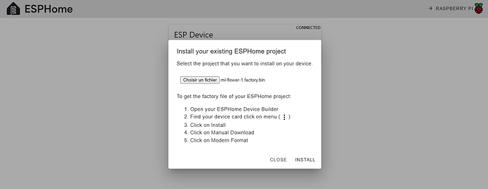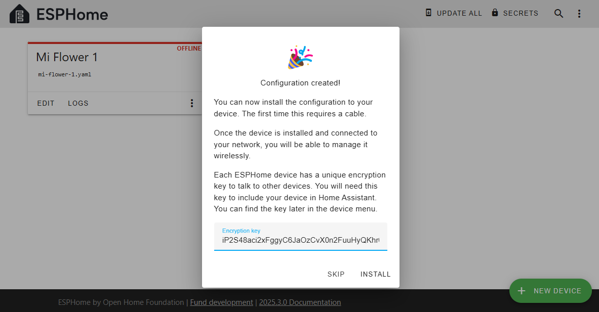 Choisissez SKIP car on va faire la configuration manuellement. Si vous cliquez maintenant sur INSTALL l’ESP32 ne sera pas correctement configuré. Vous verrez un appareil qui n’aura pas le bon nom et certainement pas en proxy Bluetooth. C’est une erreur facile lorsque l’on débute et je l’avais faite la première fois.