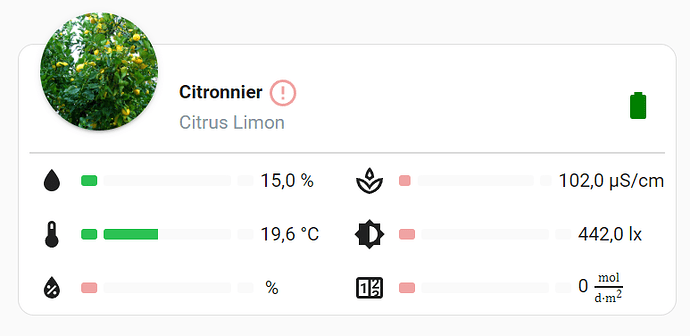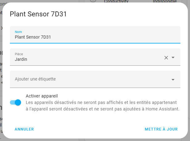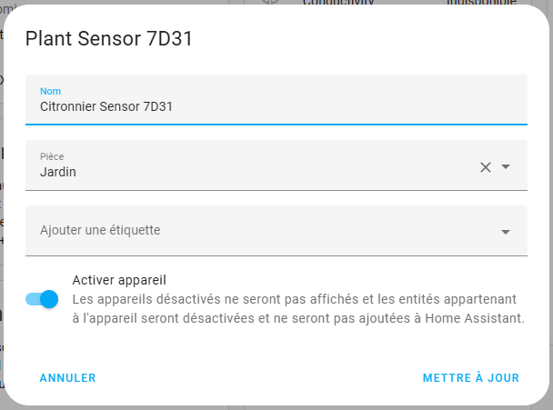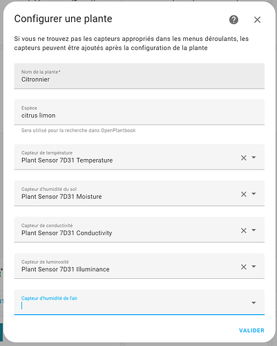 Lorsque la plante est ajoutée, on se rend compte que l’humidité n’est pas donnée par le capteur (déjà mentionné à plusieurs reprises). Il faut donc utiliser un autre capteur, comme un capteur de température Zigbee par exemple.