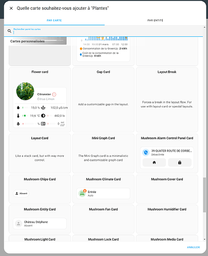 Il ne reste plus qu’à créer nos cartes : dans nos panneaux, cliquer sur ajouter une carte et sélectionner la carte Flower Card :
