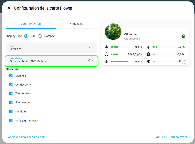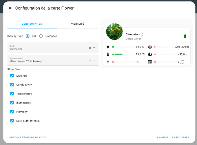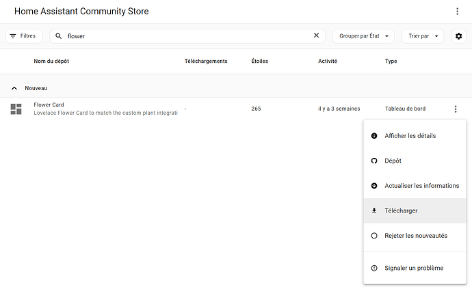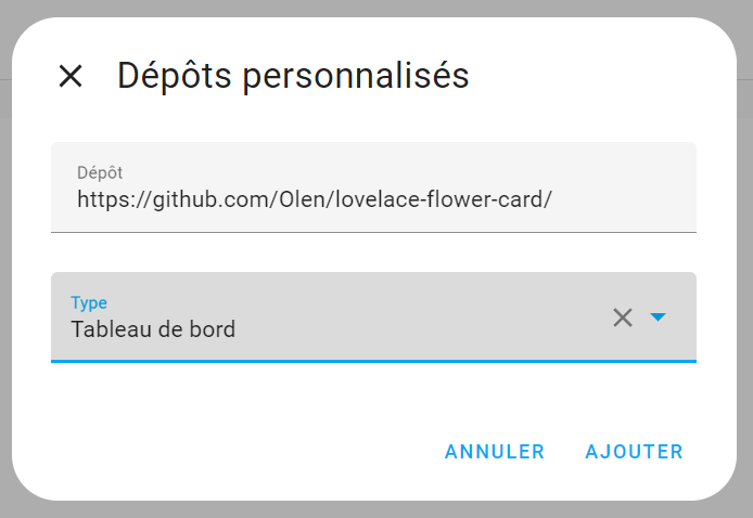 Installer la carte lovelace-flower-card avec le repo https://github.com/Olen/lovelace-flower-card/ et de type Tableau de bord puis cliquez sur AJOUTER :