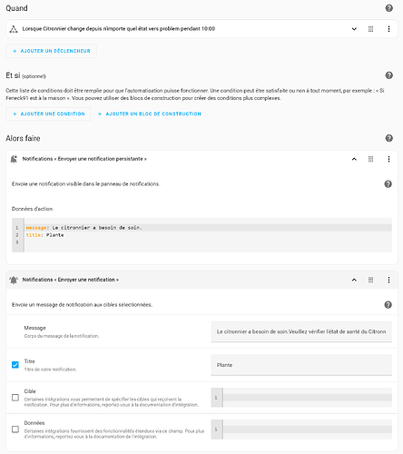 Pour être notifié en cas de problèmes avec une plante, il est possible d’être averti pour chaque capteur incorrect, chacun fait comme il veut, mais je n’ai pas fait ce choix. J’ai plutôt utilisé l’état de santé de la plante qui prend en compte l’ensemble des capteurs qui composent la surveillance de la plante.