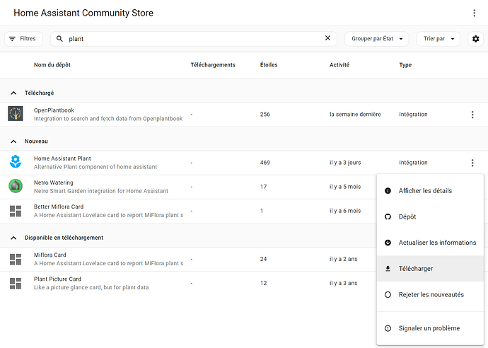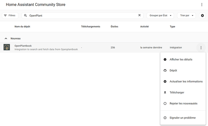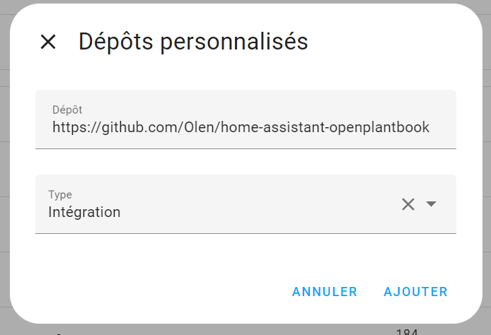 Ajouter GitHub - Olen/home-assistant-openplantbook: Integration to search and fetch data from Openplantbook.io dans un nouveau repository de type Intégration :
