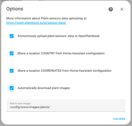 Si vous faites la reconfiguration de l’intégration, une nouvelle option apparaît, il propose de télécharger les images des plantes, cochez et validez (attention, il faut créer le répertoire indiqué s’il n’existe pas, on peut le réaliser facilement avec Studio Code Server).