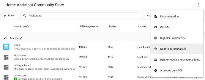 Cliquer sur les trois petits points en haut à droite de HACS et ajouter un dépôt personnalisé.