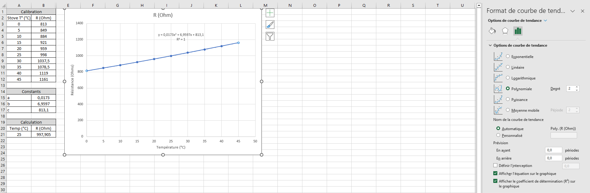 - On regarde la valeur de température vue par le poêle et on note la correspondance Résistance / Température