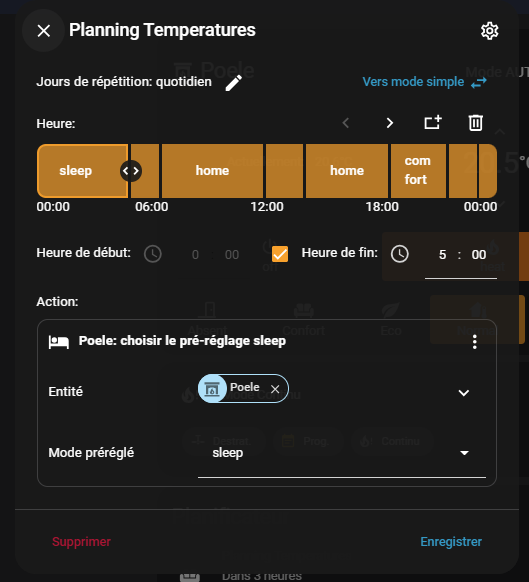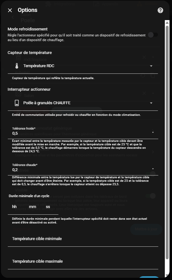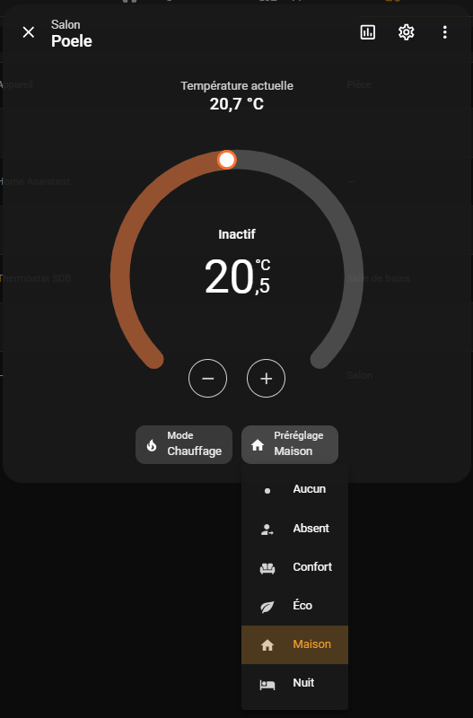 J'ai fait le choix de ne pas me séparer de la régulation de puissance du poêle, mais on pourrait sans doute exploiter la possibilité "Over Climate" de Versatile Thermostat pour ajuster la régulation et anticiper les besoins en fonction de la température extérieure. Cela demande de creuser le sujet et de faire un certain nombre d'essais, pour caler les TPI et vérifier que ça ne pose pas de problème, car ça revient à empiler des régulateurs, ce qui n'est jamais aisé.