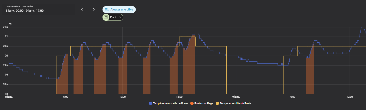 - Pour déclencher la chauffe le poêle attend une température mesurée WTI < (STT + SHY) = (21 °C + (-1 °C)) = 20 °C
