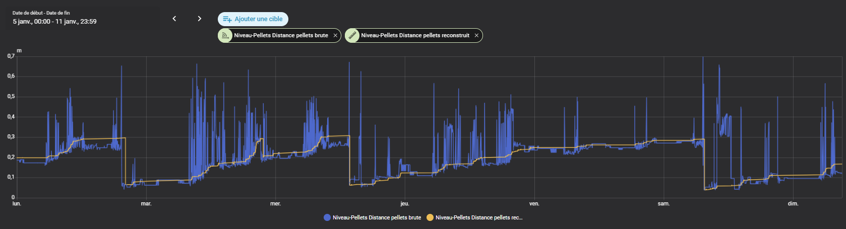 Les chutes brutales de distance sont bien capturées par le capteur qui traduit ça comme un remplissage et incrémente la consommation de granulés (1 sac = 15 kilos). On dispose d'un bouton qui permet de déclencher manuellement la prise en compte d'un remplissage si jamais ça ne s'est pas fait automatiquement.