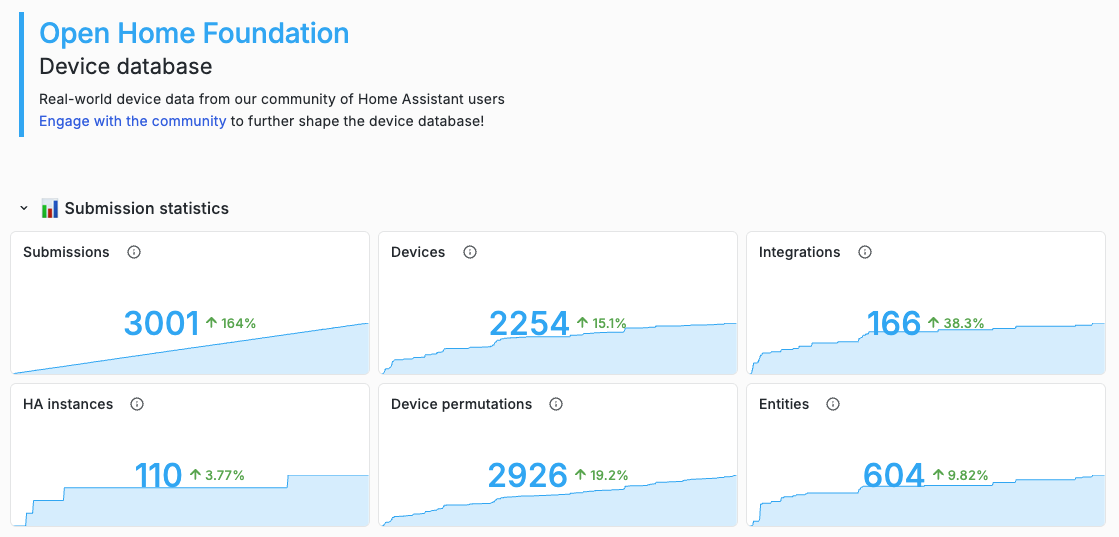 J'ai également besoin de votre aide ! La base de données des appareils de l'Open Home Foundation est en cours de construction en tant que ressource communautaire afin d'aider chacun à prendre des décisions éclairées concernant les appareils domestiques intelligents. Rendez-vous sur Home Assistant Labs pour vous inscrire et contribuer en fournissant les données anonymisées de vos appareils. 📈