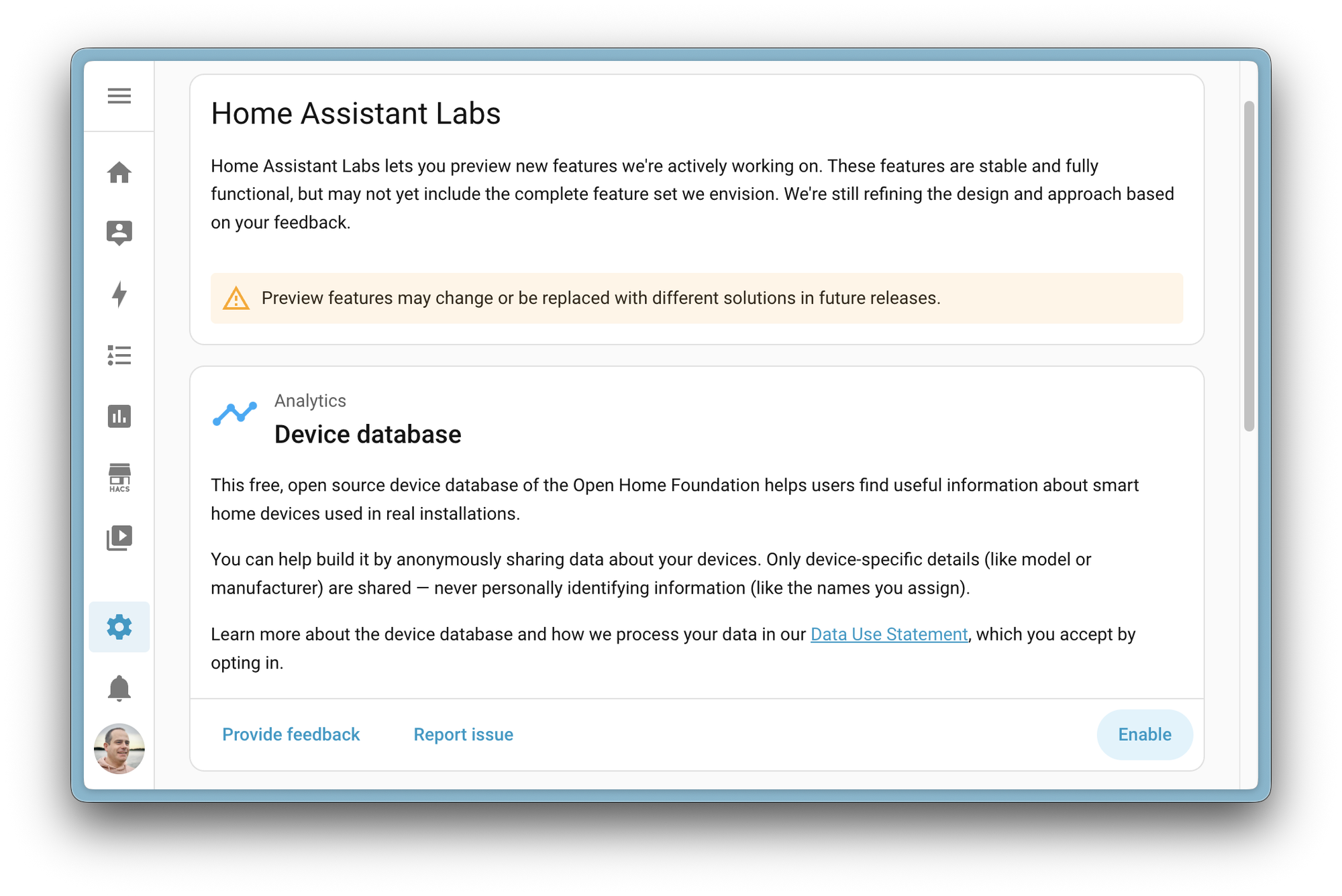 Comme nous en sommes encore aux prémices, la base de données des appareils se trouve dans Home Assistant Labs, où vous pouvez choisir de partager des informations anonymisées sur les appareils de votre domicile.
