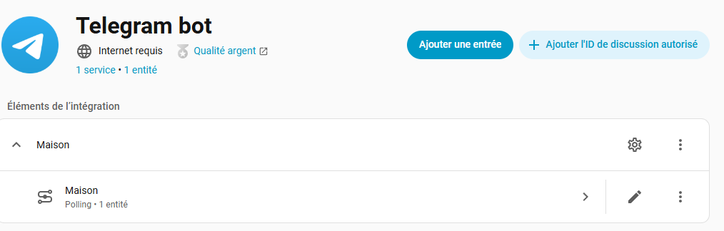 Allez dans Paramètres > Appareils et services > Ajouter une intégration, puis sélectionnez Telegram puis Telegram bot.