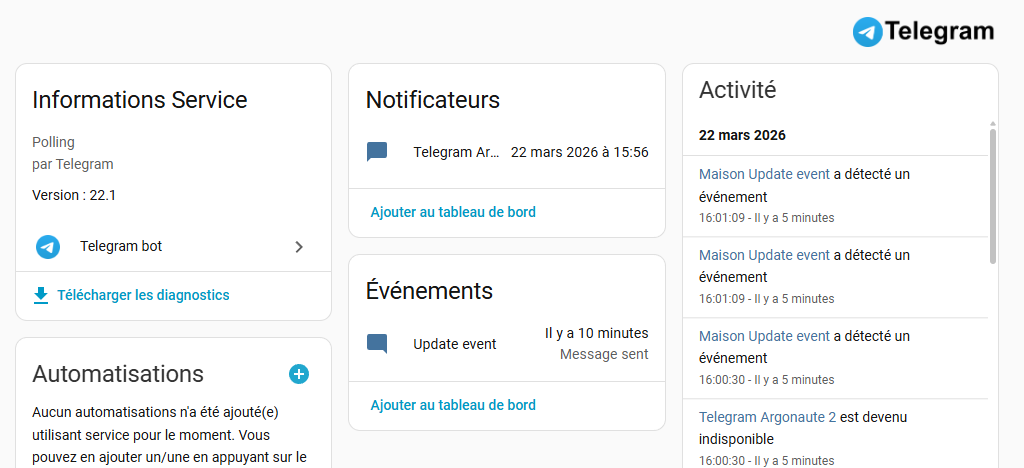 - Connecter Telegram a Home Assistant via l’intégration Telegram Bot,