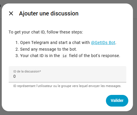 Cette partie permet de retrouver votre ID de discussion, si vous choisissez de n’envoyer des messages qu’à vous (et pas à un groupe de personnes).