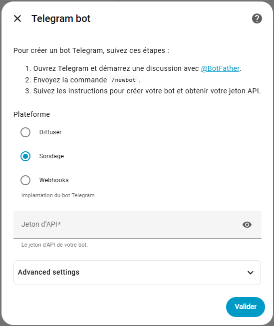 Je conseille de choisir Polling, qui permet un pilotage de Home Assistant sans exposition d'URL (webhook). Renseignez ensuite l'ID de votre BOT.