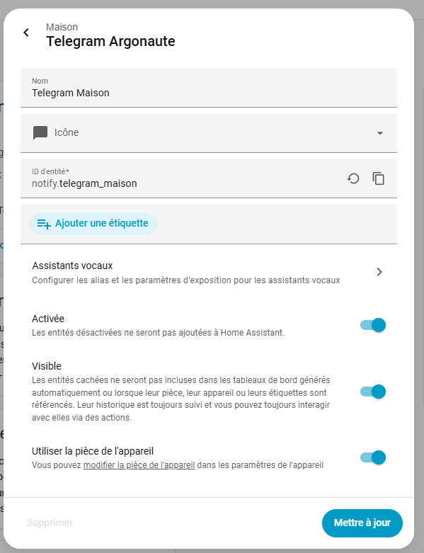Ouvrir l'entité sous Notificateurs et renommer son nom et son ID. Dans mon cas, j'ai mis Telegram Maison. J'ai renommé l'ID de l'entité notification telegram_maison.