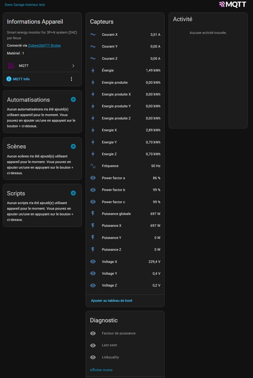 Dans Home Assistant, vous verrez apparaître plus de 20 entités. Tension, Intensité, Puissance, Fréquence, Facteur de puissance... tout y est, décliné pour chacun des trois canaux (X, Y, Z).