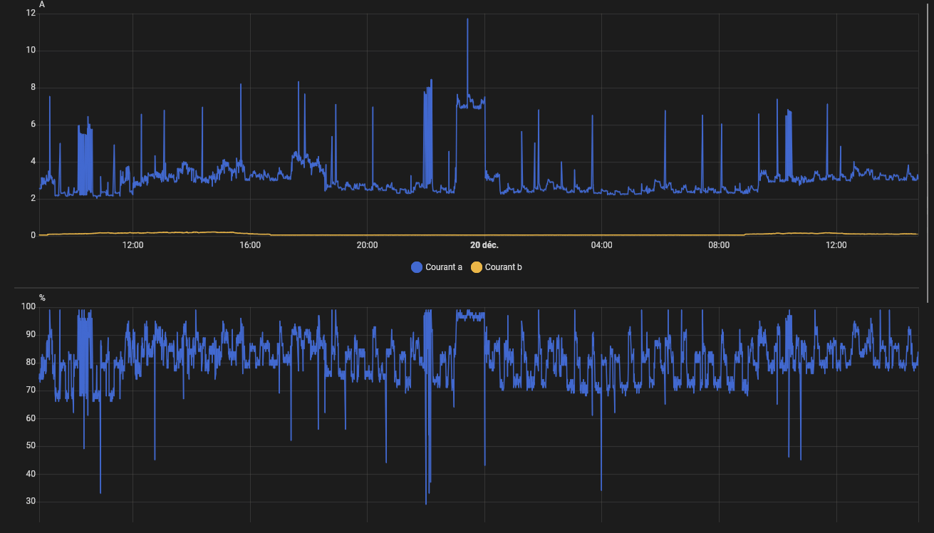 - Voltage : On remarque une précision à 0.1V près, idéal pour surveiller les surtensions ou les baisses de tension en bout de ligne.