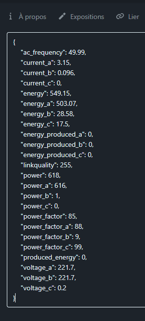 power(globale) est la somme des trois canaux. - Énergie (Energy_a, b, c) : C'est l'index de consommation cumulée (kWh). C'est cette valeur qu'il faudra utiliser dans le Dashboard Énergie de Home Assistant.